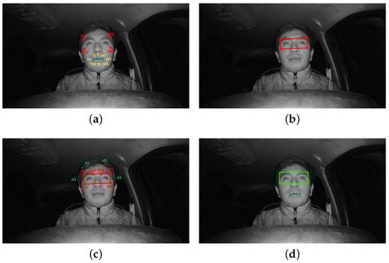 Eye area ROI improvement procedure: (a) points for two regions of interest, (b) asymmetric eye region of interest, (c) region of interest correction method, and (d) corrected eye ROI and mouth ROI.