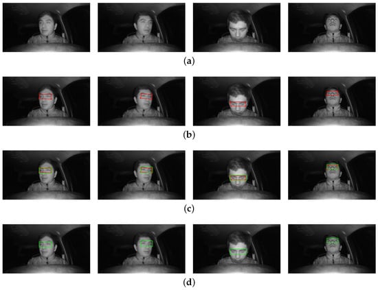 The application of the corrected ROI is illustrated in Figure 6, where different common scenarios for the driver’s head posture are shown.