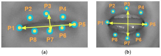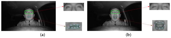 ROIs of the eyes and mouth used to determine the driver’s condition: (a) ROI image with open eyes and ROI points with closed mouth; (b) ROI image with closed eyes and ROI points with open mouth.