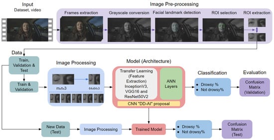 In Step 5, classification of the eye area is carried out by a CNN, applying the CNN architectures of InceptionV3, VGG16, and ResNet50V2 via transfer learning. We propose an additional CNN architecture called “Drowsiness Detection-AI (DD-AI)”, in which four CNNs conduct binary classification of the eye region as either drowsy or not drowsy. The second ROI corresponding to the mouth points is used to classify yawns using the Mouth Aspect Ratio (MAR). A set threshold is used to determine whether or not the driver is yawning. Step 5 involves a hybrid of the CNN-based and MAR-based approaches used for the eye and mouth regions, respectively.