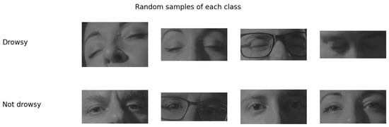 The ROI of the eye area was extracted from the six chosen videos, with the resulting dataset used train the CNNs architectures with 6800 images in total distributed into two classes (drowsy and not drowsy). The drowsy class contained 3400 images and the not drowsy class contained 3400 images. The distribution of the dataset was 70% (4760) for the training set, 15% (1020) for the validation set, and 15% (1020) for the test set. As described, the dataset was balanced for binary classification of eye status. The dataset is summarized in Table 2, with random samples shown in Figure 11.