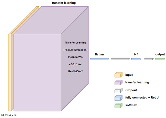 After processing the images, the architectures of each CNN network were created. The first three CNNs used transfer learning, maintaining the weights of the convolutional layers and designing only the architectures of the connected neural networks that perform the binary classification. The design is provided by the flattened layer, followed by a 25% dropout, a dense layer with 500 neurons and ReLU activation, a 25% dropout, and an output layer with two neurons with SoftMax activation. Figure 12 shows the proposed architecture using transfer learning for the InceptionV3, VGG16, and ResNet50V2 networks.