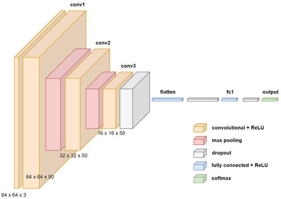 At this point, training was performed for each of the four CNNs with ten training experiments for each CNN, resulting in a total of 40 experiments for one image input size. During training, the first training set was used to train the model and the second validation set was used to validate the training. The first step in training the CNNs was to convert image sizes of the training sets. As shown in Figure 11, the images come in different sizes, while for the CNNs they have standard input sizes. In this case, the experiments were performed at a size of 64 × 64 pixels in the case of VGG16, ResNet50V2, and DD-AI and at 75 × 75 pixels in the case of InceptionV3, with all architectures using three depth layers due to the faster processing with the use of the embedded system.