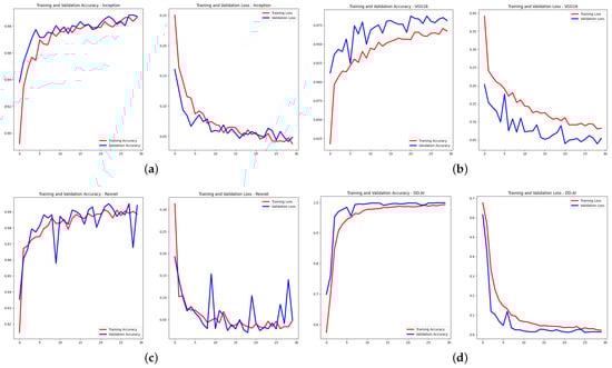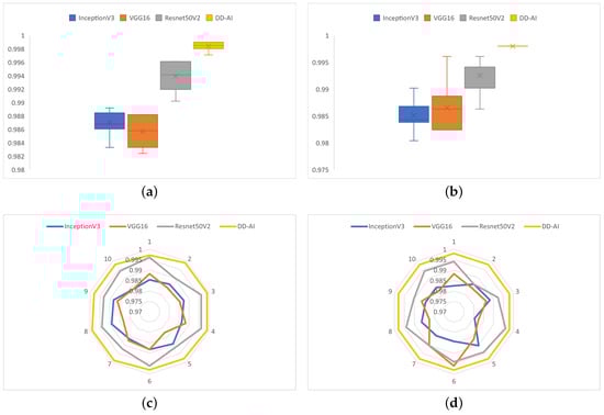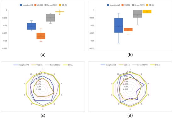Confusion matrices from CNN tests: (a) InceptionV3, (b) VGG16, (c) ResNet50V2, (d) proposed “DD-AI”.