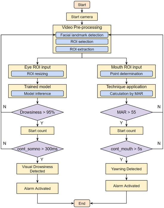 Finally, using the results obtained from Step 5 classification, an audible alarm is activated in Step 6 to warn the driver in the event that symptoms of drowsiness are detected based on the state of the eyes and mouth. In addition, the driver’s status can be viewed in real time on a 7-inch display, which is important to allow the driver or passenger(s) to monitor driver drowsiness.