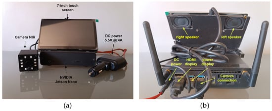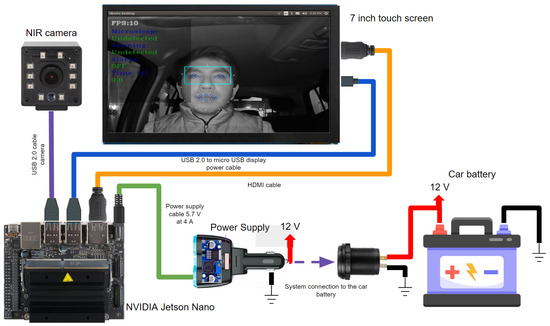 In this study, a portable real-time constant monitoring system for detecting drowsiness in drivers is proposed. This system is based on convolutional neural network algorithms such as InceptionV3 [20], VGG16 [21], ResNet50V2 [22], and a proposed network for learning the state of the eyes (open or closed) and Mouth Aspect Ratio (MAR) [23] for yawning detection by extracting facial points through Mediapipe [24]. The system is composed of an NVIDIA Jetson Nano, which is the component where all the processing and programming logic is executed; an RGB-NIR camera in charge of obtaining the images in sequence (video) of the driver; a 7-inch screen, which is the graphic interface where the driver’s status is visualized in real time; and a pair of horns which produce sound alarms when drowsiness is detected to warn the driver and avoid an accident.