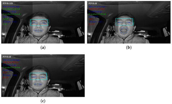 Most related studies [11,12,13,14,15,16,17,19] have the disadvantage of using an RGB camera, which significantly limits drowsiness detection in nighttime environments and varied lighting conditions. In addition, a number of prior studies [12,13,18,19] do not address yawning detection. These issues are discussed further in Section 7.