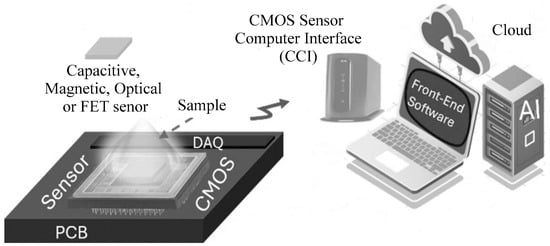 CMOS (complementary metal–oxide–semiconductor) sensors have significantly transformed the field of biosensing by enabling the integration of various sensing methodologies into a compact, cost-effective platform. The versatility of CMOS technology allows for the incorporation of multiple primary sensing methods, including field-effect transistors (FETs) [,,], capacitive sensing [,,,], impedimetric sensing [,,,], optical sensing [,,,,], and magnetic sensing [,,,,,,], each contributing to a broad range of biomedical applications. A CMOS sensing platform consists of a sensing device connected to the interface circuit that reads the variation in the sensing device and converts the changes into a digital signal. All these components are integrated into a single CMOS chip. A data acquisition system is then used to transfer the information to a computer, with the collected data being transferred to a server or cloud for artificial intelligence (AI) analysis, as depicted in Figure 1.
