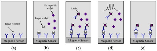 Magnetic sandwich immunoassay process: (a) the sensor surface is functionalized with a capture antibody, (b) the surface is then exposed to the sample, (c) a magnetically labeled detection antibody is introduced, (d) any non-specifically bound labels are washed away, (e) counting the remaining labels yields a measurement of the target concentration in the sample [].