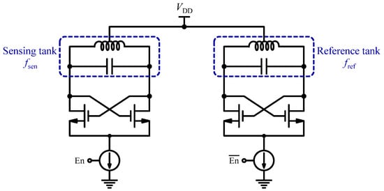 Notably, to achieve robust performance and reliable design across variations in process, voltage, and temperature, the LC cross-coupled oscillator can be implemented in feedback structures such as a phase-locked loop (PLL) or designed with a compensation circuit []. Alternatively, a current-reuse LC architecture that has ultra-low power operation [], combined with adaptive control techniques [], can serve as the core structure for an inductive sensor, resulting in enhanced performance while reducing power consumption.