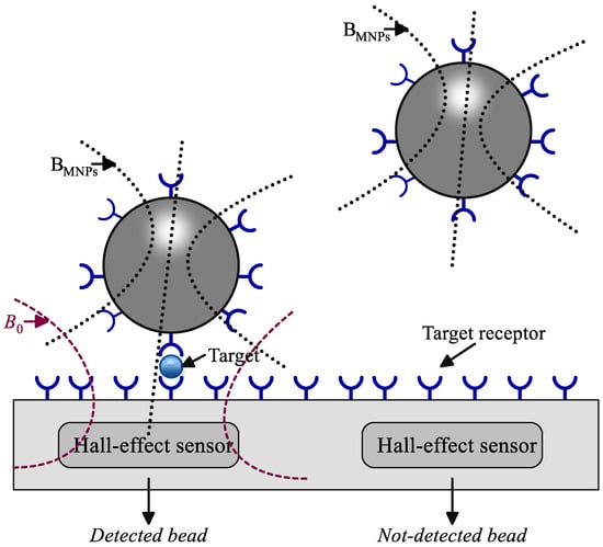 The Hall effect, identified by Edwin Hall in 1879 [], characterizes the behavior of electric charges when subjected to both electric and magnetic fields. The external magnetic field deflected charge carriers in a conductor from their usual current path. This creates a transverse electric field that halts the carrier drift, resulting in a measurable transverse electric potential known as Hall voltage. This phenomenon is referred to as the Hall effect and serves as a fundamental principle in the design of Hall effect sensors for detecting magnetic particles. In Hall effect sensors, as illustrated in Figure 4, magnetic beads (consisting of MNPs) are initially anchored to the sensor surface using specially designed affinity-based assays. An external magnetic field (B0) is subsequently applied to magnetize the bead, generating a stray magnetic field. The Hall sensor then measures the interplay between the magnetic fields, allowing for the identification of the particles.