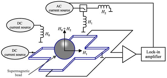 Magnetic Hall sensors can be easily integrated and scaled within CMOS technology, allowing for the development of compact and cost-effective systems. The advancement of Hall sensors for detecting superparamagnetic beads in biomedical applications was initiated by the authors of []. It was the first to successfully detect a single 2.8 μm Dynabead using a Hall sensor fabricated in 0.8 µm CMOS technology. In their study, the authors employed a phase-sensitive detection method in which a direct current (DC) magnetic field (H0) was applied perpendicularly to the sensor plane to magnetize the bead, while an alternating current (AC) field induced oscillations in the bead’s magnetic moment introduced either in the x-direction (H1) or z-direction (H2) as shown Figure 5. The Hall voltage (VH), which contains a component proportional to the magnetic induction produced by the bead, is measured with a lock-in amplifier. By incrementally adjusting the DC field, they observed corresponding changes in the magnitude of the AC Hall voltage, which served as evidence for the presence of the bead.