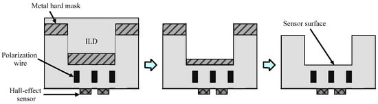 To obtain measurable signals from Hall effect sensors, it is essential to minimize the distance between the magnetic particles and the sensor surface []. A design introduced by the authors of [] focused on minimizing the distance between beads and sensors by employing reactive ion etching on the inter-layer dielectric (ILD) above the sensor area as depicted in Figure 6. Additionally, an optional metal wet etching process was utilized to remove the metal hard mask, bringing the beads an extra 0.5 μm closer to the Hall sensor array. The design includes a 64-unit Hall effect sensor array fabricated using a 0.18 μm CMOS process, enabling it to detect 4.5 μm beads (Dynabeads® M450) across its entire surface. In another study [], the ILD above the sensor area was etched, effectively reducing the distance from 9 µm to 3 µm. This modification resulted in a remarkable enhancement in signal strength, increasing it by a factor of 10 to 20 for magnetic beads approximately 1 µm in size.