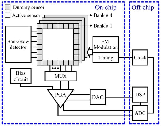To resolve the magnetic field generated by a magnetic bead in the presence of a significantly larger magnetizing field baseline, it is essential to utilize reference sensors, perform baseline calibration, and ensure temperature stabilization. However, these requirements can lead to considerable drawbacks in terms of on-chip area, power consumption, and detection time. A promising alternative to mitigate these challenges is the use of relaxation measurements, which capture the intrinsic magnetization dynamics of the beads and enable measurements that ideally do not depend on a baseline []. In this technique, the bead is first magnetized using a strong magnetic field. The magnetizing field is then rapidly removed, and detection begins, effectively eliminating the substantial baseline and allowing for the measurement of the decaying magnetic field emitted by the bead. The authors of [] proposed a CMOS Hall effect magnetic label detector tailored for biomedical assays, which utilizes the magnetic relaxation signature from microbead labels for detection. This innovative method enhances tolerance to environmental fluctuations and alleviates dynamic range requirements, thereby removing the necessity for baseline calibration and reference sensors. Figure 7 illustrates the block diagram of the prototype magnetic bead detector chip fabricated using 0.18 µm CMOS technology. Given that micron-sized beads produce only localized magnetic fields, a single large-area sensor would be ineffective. Consequently, the magnetic sensor array is structured into four banks, each consisting of 64 individual Hall effect devices. Within each bank, active sensors are strategically positioned alongside dummy sensors to reduce variations between sensors and mitigate thermal non-uniformity. In this prototype, sensor outputs are processed serially through a multiplexed readout channel, which performs critical functions such as offset rejection and signal amplification. The incorporation of embedded electromagnets within the device eliminates the need for external magnetic sources, thereby decreasing power dissipation. To ensure high accuracy, correlated double sampling (CDS), along with offset servo loops and magnetic field modulation techniques, effectively minimizes the detector offset to sub-µT levels. As a result, the system can successfully detect single 4.5 µm magnetic beads within 16 ms, maintaining a probability of error below 0.1%.