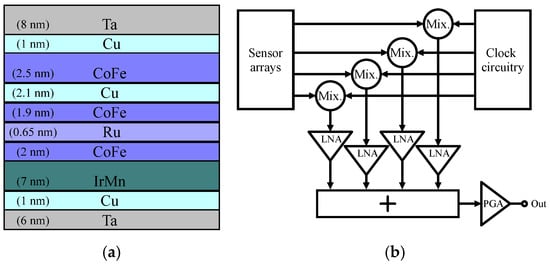 The GMR effect relies on the differing scattering processes of spin-up and spin-down conduction electrons as they traverse multilayer structures composed of ferromagnetic and nonmagnetic materials []. In these structures, the alignment of the ferromagnetic layers, either parallel or antiparallel, can be carefully manipulated. By applying a magnetic field, the relative orientation of the magnetizations in the two ferromagnetic layers can be altered. When the magnetizations align, the electrical resistance of the system decreases. Conversely, when the magnetizations are aligned antiparallel, the resistance increases. This phenomenon underpins the functionality of GMR sensors, which can identify magnetic particles and serve as a foundation for creating biochips []. A commonly utilized configuration of GMR sensors is the spin-valve (SV) sensor, which is known for its high sensitivity at room temperature and its straightforward fabrication process with CMOS technology [,,,,,,]. The SV usually consists of a pinned layer that has a stable magnetization, alongside a free layer that allows its magnetization to adjust freely in response to an external magnetic field during operation. For instance, the authors of [] developed a 1008 array (16 subarrays) of GMR-SV sensors that was implemented in a 0.25 μm BiCMOS process to detect DNA hybridization. Figure 8a illustrates the top view of the sensor, along with the annotated thicknesses of the GMR-SV sensor film stack integrated with a CMOS chip. When MNPs bind to the hybridized DNA, the resistance of the sensor changes. The resulting electrical signals are then measured directly using the readout circuit that is illustrated in Figure 8b. In this study, frequency-division multiplexing (FDM) and time-division multiplexing (TDM) techniques are employed to reduce the signal readout time from each array. A single 42 kHz master clock generates four carrier frequencies through the clock circuitry for the mixers. This modulation enables FDM, to shift the signal spectrum upward to minimize the impact of 1/f noise in subsequent circuits and effectively separate the desired signals from electromagnetic interference (EMI). The low-noise amplifier (LNA) offers a gain of 18, with an input-referred noise level below 50 nV/√Hz. A programmable-gain amplifier (PGA) with selectable gains of 1, 10, or 100 is incorporated to optimize the system’s dynamic range. The final output is digitized by an off-chip analog-to-digital converter (ADC), and tone measurements are conducted using a fast Fourier transform (FFT) analysis []. The GMR-SV sensor is capable of identifying approximately 100 magnetic nanotags for each sensor during DNA hybridization assays conducted at a DNA concentration of 10 nM.