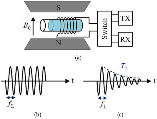 The operational principle of the NMR system is as follows (see Figure 9). In the first step, an RF signal at a specific frequency of ωL (Larmor frequency) is transmitted to the coil, generating an RF magnetic field, B1, that resonantly excites the nuclear spins within the sample. After the RF excitation is turned off by switching the coil to receiver (RX) mode, the spins precess around the B0 axis at the frequency ωL (where ωL = γB0, with γ denoting the gyromagnetic ratio). During this precession, the spins gradually lose phase coherence due to spin–spin interactions, resulting in exponential relaxation of the net magnetic moment. As the spins precess and relax, the coil detects an NMR signal, which appears as a damped sinusoidal waveform characterized by the spin–spin relaxation time, T2. NMR systems are typically designed as relaxometry, spectrometry, or magnetic resonance imaging (MRI) devices. In relaxometry, the primary goal is to measure T2, as the rate of phase decoherence varies among materials containing 1H protons. Spectrometers focus on measuring and identifying the spectrum and its components, while MRI utilizes T2 measurements at various locations within a body part to create a spatial heat map of T2.