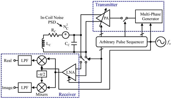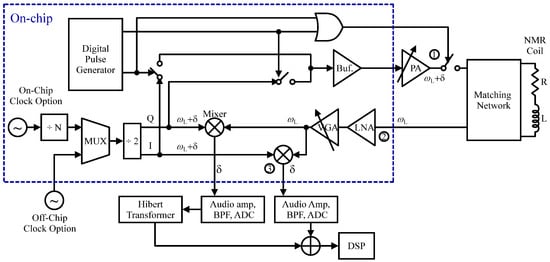 - Kim, J.; Hammer, B.; Harjani, R. A 5–300MHz CMOS transceiver for multi-nuclear NMR spectroscopy. In Proceedings of the IEEE 2012 Custom Integrated Circuits Conference, San Jose, CA, USA, 9–12 September 2012; pp. 1–4. [Google Scholar]