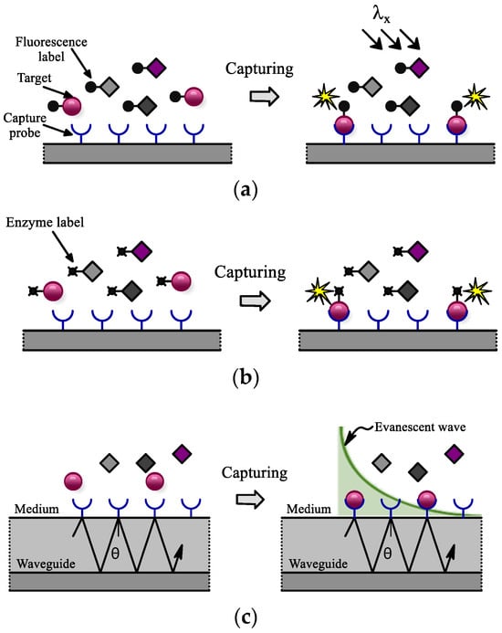 In fluorescence-based biosensors, as depicted in Figure 12a, fluorophores as label targets absorb excitation light at a specific wavelength and, after binding to immobilized probes, emit photons at a different wavelength. This interaction produces an optical signal that can be detected by photosensitive elements after filtering out background light. Bioluminescence biosensors (Figure 12b) rely on a chemical reaction for signal photoemission, eliminating the need for an excitation source or filter, which reduces background noise. This makes bioluminescence a cost-effective and easily integrated solution for LoC applications compared to fluorescence methods. Evanescent field detection is a popular label-free method for optical biosensors, enabling real-time monitoring of molecular interactions (Figure 12c). It involves a receptor layer on a waveguide surface where the waveguide’s refractive index is higher than that of the surrounding medium. When light strikes the waveguide at an angle exceeding the critical angle, an evanescent wave penetrates slightly into the lower index medium, allowing for interaction detection between the receptor and analyte. This approach limits interaction with materials adjacent to the surface, avoiding interference from unbound substances in the solution. Silicon photonic biosensors are commonly used in this method and are compatible with CMOS technology.