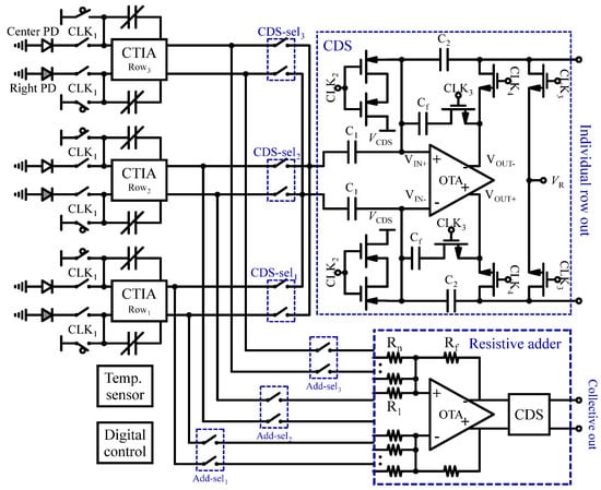 In another study [], a fully integrated fluorescence sensor designed for the dynamic monitoring of living cells is introduced. This innovative design, detailed in Figure 13, features on-chip bandpass optical filters, photodiodes, a capacitive transimpedance amplifier (CTIA), CDS, and a resistive adder block, all implemented in 65 nm standard CMOS technology. The study effectively captures signals from various optical filters and photodiodes arranged differentially across the central and left/right columns of the chip. This is accomplished by utilizing six rows of front-end circuitry. Each row employs a CTIA with a variable feedback capacitor to convert the differential photodiode current into a voltage signal. To mitigate low-frequency correlated noise and offsets, the CDS circuit samples the CTIA output twice per row. To optimize area and minimize power consumption, a single CDS block is shared among every four rows through the use of CDS-Sel switches. Additionally, a resistive adder is integrated to combine the outputs from multiple rows, enhancing overall signal strength. The sensor also includes an on-chip thermal sensor, along with a clock generator and a digital scan chain block, facilitating efficient distribution of all digital control signals throughout the circuit.
