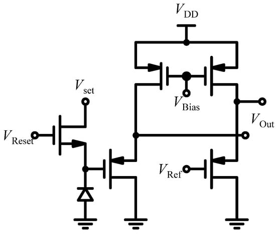 Bioluminescence provides several benefits compared to fluorescence assays, such as reduced background noise and the utilization of reagents with extended shelf life []. Additionally, it simplifies LoC integration by eliminating the need for filters and light sources []. For instance, in [] the authors developed an LoC system featuring integrated bioluminescence detection for gene expression analysis, including reporter gene assays, intracellular adenosine triphosphate (ATP) measurement, and DNA sequencing. This system utilizes a straightforward fiber-optic faceplate with immobilized luminescent reporters and probes, which connects directly to an optical detection, thereby processing CMOS SoC fabricated with a 0.18 µm process. The SoC includes an 8 × 16-pixel array, a 128-channel 13-bit ADC, and a 16-column digital signal processing (DSP) single-instruction multiple-data (SIMD) array, and it consumes 26 mW. The schematic of each pixel is shown in Figure 14 and consists of a P+/N/P-sub photodiode, an NMOS reset gate, and two PMOS source followers, one connected to the photodiode and the other linked to a global reference signal, VREF. The PMOS follower circuit is employed to lower the operating voltage range of the photodiode, thereby reducing dark current and enhancing linearity. It can detect emission rates below 10−6 lux over a 30 s integration period at room temperature. Notably, a critical aspect of designing DNA sequencing systems is managing the low signal levels in miniaturized biological assays. Consequently, high-resolution ADC conversion is vital for accommodating the broad dynamic range of outputs from the sensor array. To tackle this, the authors of [] developed a high-resolution ADC for miniaturized megapixel DNA sequencing arrays utilizing bioluminescence detection in 0.18 µm CMOS technology. This ADC achieves a dynamic range of 90.1 dB and a peak signal-to-noise plus distortion ratio (SNDR) of 86.3 dB at a conversion rate of 1 MSample/s, with a power consumption of 38.1 mW. This performance allows for scanning a one-megapixel sensor array in one second, which is significantly faster than the typical integration times for image sensors used to capture bioluminescence signals [].