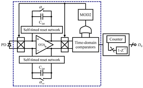 In another study, a photocurrent readout with dynamic range of 124 dB for bioluminescence sensing is presented by the authors of [] in 0.18 µm CMOS technology and is depicted in Figure 15. It features a current TIA with an asynchronous flip switch at the input, two reconfigurable time-domain all-digital comparators, and a digital counter. The outputs of the two comparators are XOR-ed to produce the necessary control signals for the asynchronous current TIA input/output flip switch. This differential readout design was primarily implemented to reduce common-mode noise, maintain balanced sensor impedance at the differential inputs, and increase the dynamic range by 6 dB compared to a single-ended configuration. Additionally, the photodiode operates in photovoltaic mode, eliminating the need for voltage biasing. This design is intended to enable in vitro NanoLuc (NLuc) luciferase-based bioluminescence sensing for the quantification of biomolecules at room temperature, with initial biological testing discussed in this article.