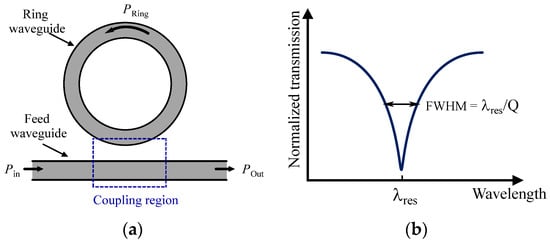 Silicon photonic biosensors are among the most commonly used evanescent wave biosensors for analyses applicable to clinical diagnosis and other versatile applications, with the added benefit of scalable production through CMOS fabrication methods [,,]. Silicon photonic biosensors can be categorized into two main types: resonant architecture and interferometric architecture. Each type presents its advantages and disadvantages in terms of sensitivity, limit of detection (LoD), compactness, and system complexity. A frequently employed silicon photonic structure in this field is the ring resonator [,,,,]. For instance, the authors of [] introduced a fully integrated electronic-photonic platform utilizing a zero-change, high-volume CMOS silicon-on-insulator (SOI) process, specifically designed for molecular and ultrasound sensing applications. By co-integrating 10 μm micro-ring resonators (MRRs) with on-chip electronics, they effectively meet the current demands for scalability, power efficiency, and compactness. This approach enables nanophotonic sensing and readout processing within a monolithic electronic–photonic system-on-chip (SoC). As depicted in Figure 16a, MRRs consist of a feed waveguide coupled to a circular waveguide. When the wavelength of the input light causes the phase shift accumulated around the ring to be an integer multiple of 2π, the ring is considered to be in resonance. At this point, destructive interference occurs at the output port of the ring, leading to maximum power circulation within the ring. Conversely, at off-resonant wavelengths, more power is transmitted to the output port, resulting in the Lorentzian-shaped transmission spectrum depicted in Figure 16b, where the full width at half maximum (FWHM) is also highlighted.