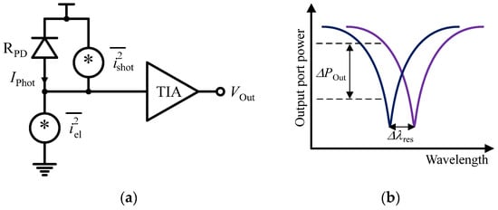 where λres is the resonant wavelength. Changes in neff lead to shifts in λres [], and this wavelength shift serves as a quantitative measure of the binding events occurring near the surface. As illustrated in Figure 17, this power fluctuation can be converted into the electrical domain using a photodetector, followed by a TIA [].