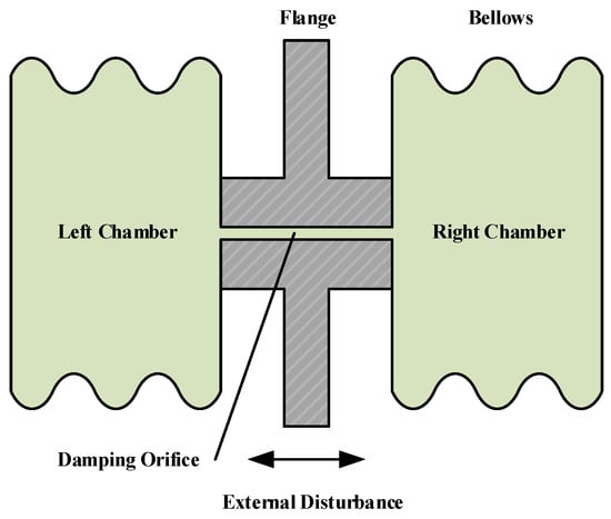 In this paper, the damping fluid was modeled as a compressible elastomer, and the damping model for the bellows-type fluid damper was developed using hydraulic fluid dynamics theory. Figure 3 illustrates the schematic diagram of the damping element of the bellows-type fluid damper. The flange inside the damper divides the space into two uniform chambers. When the flange is subjected to sinusoidal excitation, it undergoes a reciprocating motion, causing the damping fluid to flow back and forth between the two chambers through the damping orifices. During this process, part of the fluid flows directly through the damping orifices to the other chamber, while the remaining fluid is compressed under the chamber’s pressure. The motion of the fluid between the two chambers is described by the following differential equation.
