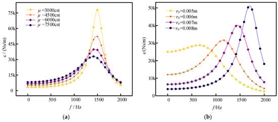 In bellows-type viscous fluid dampers, the damping coefficient is significantly influenced by several design parameters. Thus, it is crucial to investigate how different design parameters affect the damper system. Figure 4a illustrates the variation in system damping with frequency for various damping fluid viscosities. The figure shows that there is a peak value in the damping coefficient. For instance, with a damping fluid viscosity of 3000 cst, the damping coefficient initially increases with frequency. After reaching a peak value, it gradually decreases as the frequency continues to rise. This behavior is due to the energy loss associated with fluid flow through the damping orifice. The magnitude of this energy loss depends on the flow rate through the orifice and the fluid resistance. At low excitation frequencies, most of the fluid within the stroke of the damper flange can flow through the damping orifice. As the frequency increases, both the flow through the orifice and the damping coefficient increase. However, as the frequency continues to rise, the cavity pressure increases, compressing the fluid further. Eventually, this causes the flow through the orifice to decrease and the damping coefficient to diminish. Overall, the damping coefficient exhibits an increase followed by a decrease with frequency, resulting in a peak damping value. Higher viscosities in the damping fluid lead to a more pronounced damping effect in the low-frequency range and a more stable overall damping value. Conversely, lower viscosities enhance the damping effect near the peak frequency.