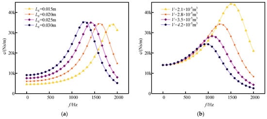 Figure 5b illustrates how damping varies with frequency for different cavity volumes. Since changes in cavity volume do not affect fluid resistance, the primary factor influencing the damping coefficient is the flow rate through the damping orifice. Larger cavity volumes result in a smaller proportion of fluid within the damping orifice relative to the total volume, which makes the fluid more easily compressible. Conversely, smaller cavity volumes lead to a larger proportion of fluid in the damping orifice, increasing the damping peak value and enhancing the overall damping effect. Thus, smaller cavity volumes provide a broader range of high damping and a more effective overall damping performance.