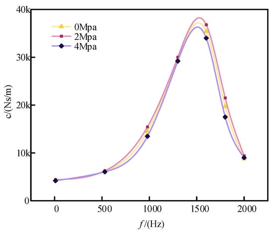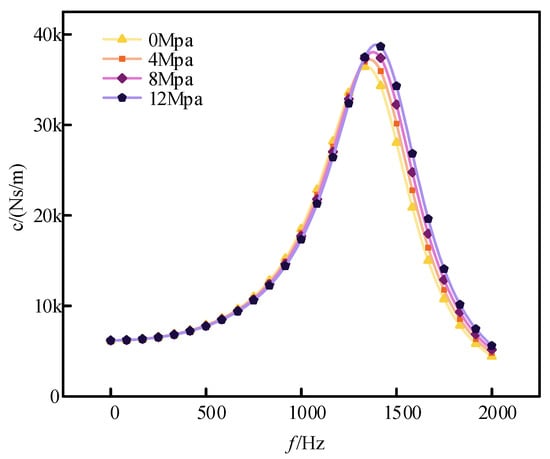 To assess the effect of cavity pressure on the damper’s damping coefficient, the damping fluid cavity was compressed using an internal pressure adjustment mechanism. The damping measurement experiment was then repeated to obtain damping curves under various pressures as a function of frequency, as shown in Figure 11. Comparing the damping coefficients at different cavity pressures reveals that increasing the pressure effectively enhances the damping coefficient of the damper. As indicated in Table 1, the damping coefficient increases with pressure, and the error between the experimental data and theoretical calculations remains within 4%.