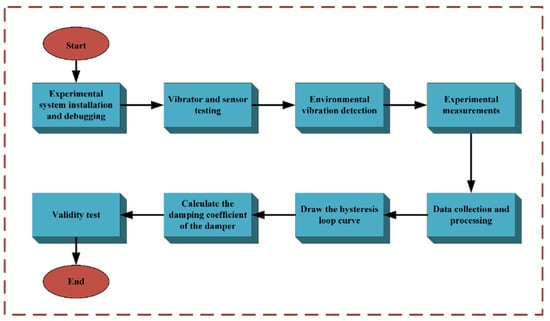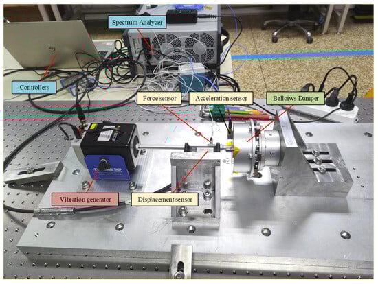Figure 8 illustrates the experimental procedure. A sinusoidal scanning signal from the experimental signal generator was amplified by a power amplifier and fed into the shaker, exciting the entire system. Simultaneously, signals from the force sensor, acceleration sensor, and displacement sensor were synchronized with data acquisition through the data collector. The measured acceleration data were then processed using frequency domain integration to convert them into displacement information. This allowed for the determination of the force–displacement relationship at each frequency and the plotting of the hysteresis loop curve. The damping value at each frequency was calculated using viscoelastic theory. The input frequency of the shaker was varied according to an incremental scheme, and the experiment was repeated to obtain the damping–frequency curve for each pressure setting. The damper’s compression-damping liquid cavity was then adjusted to change the cavity pressure, and the experiment was repeated to determine the damping coefficient as a function of cavity pressure.