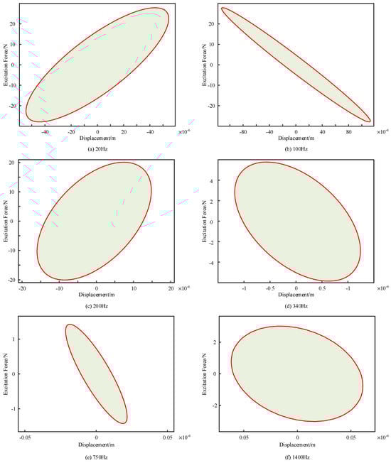 The hysteresis loop curves were approximated and fitted to the measured data to determine the damping coefficients of the damper at the current excitation level. The input frequency of the shaker was then varied incrementally to obtain hysteresis loop curves at selected frequencies, as illustrated in Figure 9. The damping coefficients corresponding to each hysteresis loop curve were calculated, and the results were fitted to produce damping versus frequency curves. These curves, measured at various frequencies, are shown in Figure 10a.
