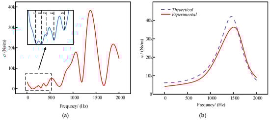 To ensure the precision of the damping coefficient measurements, data points near the modal frequencies were excluded, and the resulting graphs were re-plotted. Near modal frequencies, significant resonance effects can occur, leading to a pronounced amplification of the vibration response. Such resonance phenomena introduce nonlinear distortions that compromise the accuracy of the damping coefficient measurements. Specifically, the concentration of vibrational energy at these frequencies results in extreme response amplitudes, which deviate from the true damping characteristics of the system. Consequently, excluding measurements within these resonance-affected frequency ranges is crucial to obtain reliable data. Figure 10b presents a comparison between the optimized experimental damping curves and the theoretical curves. The alignment of trends between the two validates the effectiveness of our approach to mitigate resonance effects, thereby providing more accurate experimental data and reinforcing the applicability of the theoretical model for damper design.
