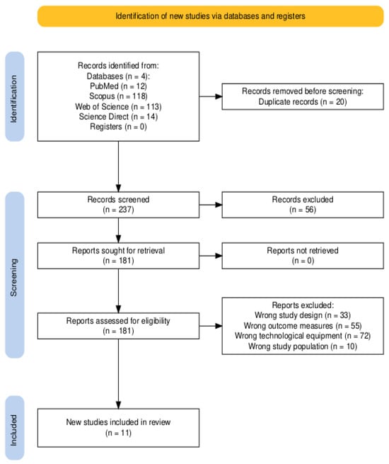 A total of 257 articles were found in PubMed, Scopus, Web of Science, and ScienceDirect. After screening for title relevance and duplicates, 20 articles were excluded. An additional 56 articles were excluded due to language, incorrect study aims, incorrect study populations, or inappropriate therapeutic approaches. Consequently, 181 full-text articles were screened, and 11 studies were selected for inclusion in this review (see Figure 1).