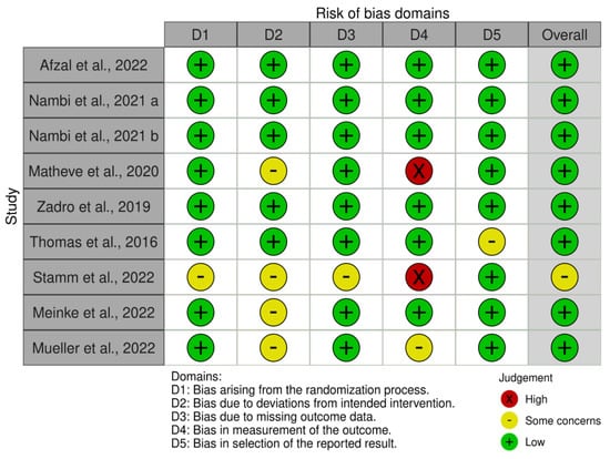 The high risk in the measurement of the outcome domain due to the potential lack of blinding is notable. This is contrary to Meinke et al. [22] and Mueller et al. [23], who both reported an overall low risk of bias. In particular, Meinke et al. [22] demonstrated a low risk of bias, with some concerns primarily due to the lack of participant blinding, which is often challenging to achieve in behavioral interventions. In Mueller et al.’s study [23], a low risk of bias was reported in most domains, with some concerns primarily related to the lack of detailed information on adherence to intervention protocols and blinding of outcome assessors.