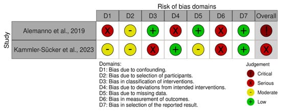 Non-randomized clinical studies had some serious risk of bias (see Figure 3). Specifically, Alemanno et al. [25] presented a mixture of serious and low risks of bias, with the most significant concerns related to confounding factors, deviations from intended interventions, and the measurement of outcomes. The study was single-armed, with no control group, making it difficult to attribute changes solely to the intervention without accounting for potential external influences. Furthermore, Kammler-Sücker et al. [24] presented a serious risk of bias due to the significant issues in the classification of interventions and the measurement of outcomes. Regarding the latter, outcome measures were well-defined, but there is a risk of bias due to the lack of blinding of outcome assessors, as well as for the classification of the intervention.