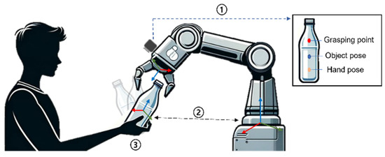 In HRIs, the process of handling objects necessitates a multitude of technologies. Several studies have focused on enhancing handover stability. Taunyazov et al. [14] developed a system that integrates sensors into robot grippers to detect the texture of objects. This system accurately identifies the characteristics of objects and contributes to their safe handling by robots during their interactions with humans. Another study by Pang et al. [15] enabled safe handovers between humans and robots using a technique that combined recorded video and cognitive algorithms. They utilized robot vision to recognize and handle unknown objects precisely, thereby enhancing the safety and efficiency of robot handovers. Christen et al. [16] studied the process of robots learning to receive objects from humans using reinforcement learning and point-cloud data. Their research focused on motion and grasp planning, as well as the optimization of robot movements, to implement a more natural handover experience.