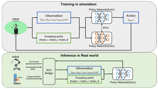 Figure 2 illustrates the simulation training process based on the aforementioned conditions and the steps for implementation in a real environment. During the simulation training, the state of the robot is obtained from the simulation, and the target object is randomly spawned to generate a random grasping point. These data are used in the PPO algorithm for reinforcement learning, and the action derived from the trained network is sent to the simulation controller, enabling the robot to assess the situation in real-time and make appropriate movements.