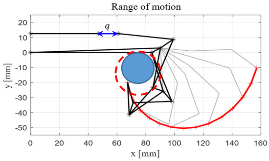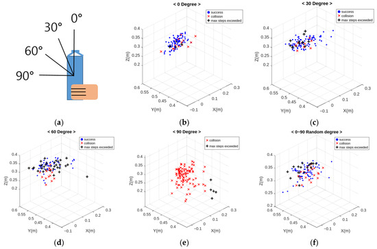 Figure 14 illustrates the experimental outcomes based on the inclination angle of the object, with different symbols on the graph representing the position of the gripper at the conclusion of each episode. The blue dots denote successful episodes in which the gripper reached a position appropriate for grasping the object. In contrast, red “x” marks are used for episodes where the gripper makes contact with the object but collides with a part other than the intended grip point. The black “+” marks signify episodes where the gripper failed to make contact with the object, ending the episode in mid-air.