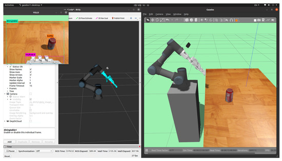 In the real environment, the ROS framework is applied to obtain the robot’s state. Unlike in the simulation, the target object is recognized, and its location information is obtained by applying YOLO and Darknet ROS. The acquired information is then fed into the trained network to generate an appropriate action, which is used to command the robot’s motors.