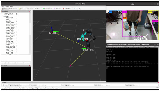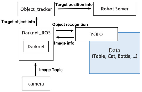 As shown in Figure 4, when the camera captures an image, it is sent to Darknet ROS via a ROS topic, where Darknet classifies the image. Then, YOLO identifies the target object, and the object tracker calculates the coordinates of the object, which are transmitted to the robot server. The robot server plays a crucial role in transmitting information received through ROS topics to the reinforcement learning algorithm. These processes are illustrated in Figure 5.
