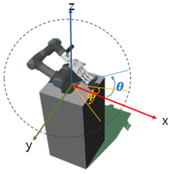The position of the object should be randomly spawned within the operational workspace of the UR robot and within the field of view of the camera, both of which are components of the agent. Therefore, a specific area was designated for this purpose. This specific area corresponds to the range of 17/12 π ≤ ϕ ≤ 19/12 π in the x-y plane and 0 ≤ θ ≤ 1/6 π in the x-z plane, and the coordinates can be found in Figure 6.