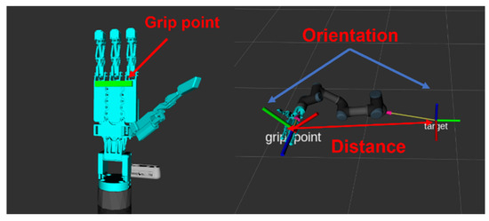The first term, Euclidean distance, which is illustrated in Figure 7, indicates the shortest 3D distance between the grip point and the target grasping point. The grip point, referring to the region on the HRI hand capable of grasping an object, is located where the palm and fingers converge, measuring approximately 3–4 cm. When the distance between the grip point and the object is smaller than the distance threshold, and the grip point touches the surface of the object, is assigned. The distance threshold is determined based on the red dashed circle in Figure 3, which represents the optimal gripping range of the HRI hand. The red dash circle has a radius of 3 cm with a margin of ± 3 cm, and the distance threshold is set at 9 cm.