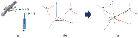 As shown in Figure 8, the coordinate system of the gripper has the y-axis pointing in the direction of the thumb finger. Therefore, when the z-axis of the object aligns with the y-axis of the gripper, the orientation is considered optimal for grasping the object. Transformation matrices are employed to numerically express whether the y-axis of the gripper and the z-axis of the object are aligned. The base of the UR robot is defined as the reference frame, the frame of the gripper is denoted as {g}, and the frame of the object is denoted as {t}. These two frames are translated so that their origins align with the origin of the reference frame while their directions remain unchanged. We denote the translated frames as {g’} and {t’}, respectively. The rotation matrices for these frames with respect to the reference frame can be expressed by Equations (7) and (8).