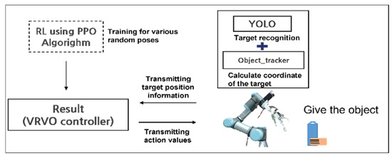 Figure 1 shows a case that satisfies the three fundamental conditions mentioned above. To satisfy the first condition, we use a camera and YOLO to recognize the object and set the grasping point in the opposite direction to where the person is holding it. Next, to fulfill the second condition, we use an object tracker to transform the relative coordinates of the camera and object based on the reference frame to calculate the location of the manipulator’s end effector. Finally, since the person may not always present the object at the same coordinates, reinforcement learning is employed to allow the manipulator to grasp objects in random poses.