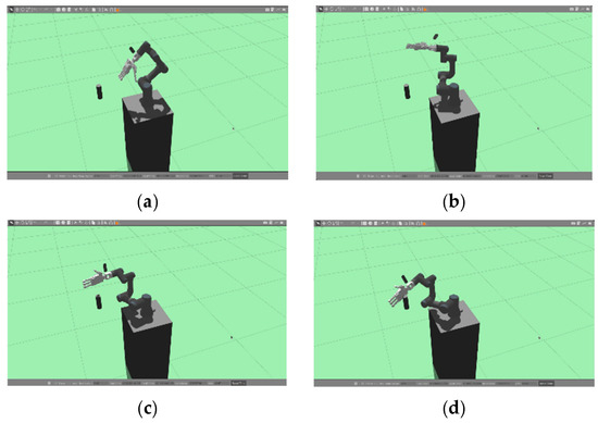 Movement of the UR3 when trained with the orientation term in the reward function. It can be observed that the robot’s thumb moves sequentially from (a–d), and in (d), the thumb points upward, making contact with the object using the palm of the hand.