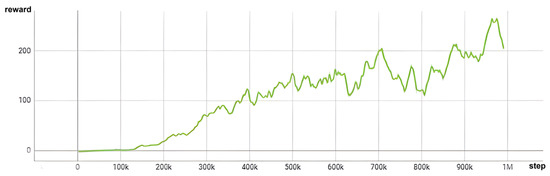 The columns of the rotation matrix represent the transformed unit vectors along each coordinate axis of the reference frame. Therefore, by taking the dot product of the components in the second column of the matrix in Equation (7) and the third column of the matrix in Equation (8), we can numerically determine the angle between the y-axis of the gripper and the z-axis of the object. Because the vectors are defined as unit vectors, the dot product value approaches 1 as they become more parallel and approaches 0 as they become more perpendicular. For this reason, the second term of the reward function is defined as orientation −1. The subtraction of 1 is intended to reduce the magnitude of the value reflected in the reward. This adjustment is aimed at increasing the influence on the distance when the y-axis of the gripper aligns with the z-axis of the object. As a result, the reward is structured to guide the gripper closer to the object in the correct direction and orientation. The orientation weight is assigned a positive value to highlight this particular aspect, encouraging the gripper to approach the target grasping point correctly.