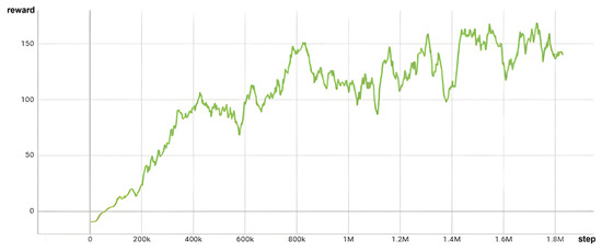 When training in scenarios with a reward function based on orientation, it is crucial to incorporate both distance and orientation into the reward calculation. This strategic inclusion is key for aligning the thumb of the HRI hand with the z-axis of the target object, which is a critical factor in achieving successful grasping. The effectiveness of this approach is evident in Figure 13, where the reward value steadily increases and eventually converges to approximately 140 after 800,000 steps. This pattern of convergence is a clear indicator of effective learning and adaptation of the system to the task requirements.