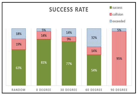 The data in Figure 15 provide an in-depth look at the success rates correlated with various angles of the object. The success rate peaks at 81% when the object is upright at 0°. However, as the tilt angle of the object increased to 30°, the success rate declined slightly to 77% and then more markedly to 54% at a 60° tilt. At a complete tilt of 90°, most episodes resulted in collisions with no successful grasping attempts recorded. An interesting aspect is the aggregate success rate of 63% when the gripper attempted to grasp objects at random angles ranging from 0° to 90°